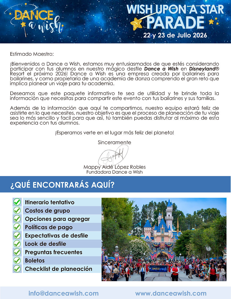 En las siguientes imágenes te compartimos toda la información para que puedas postularte para participar en nuestro próximo desfile en Disneyland 2026, incluyendo COSTOS de paquetes, requisitos de participación, fechas de pago, etc...